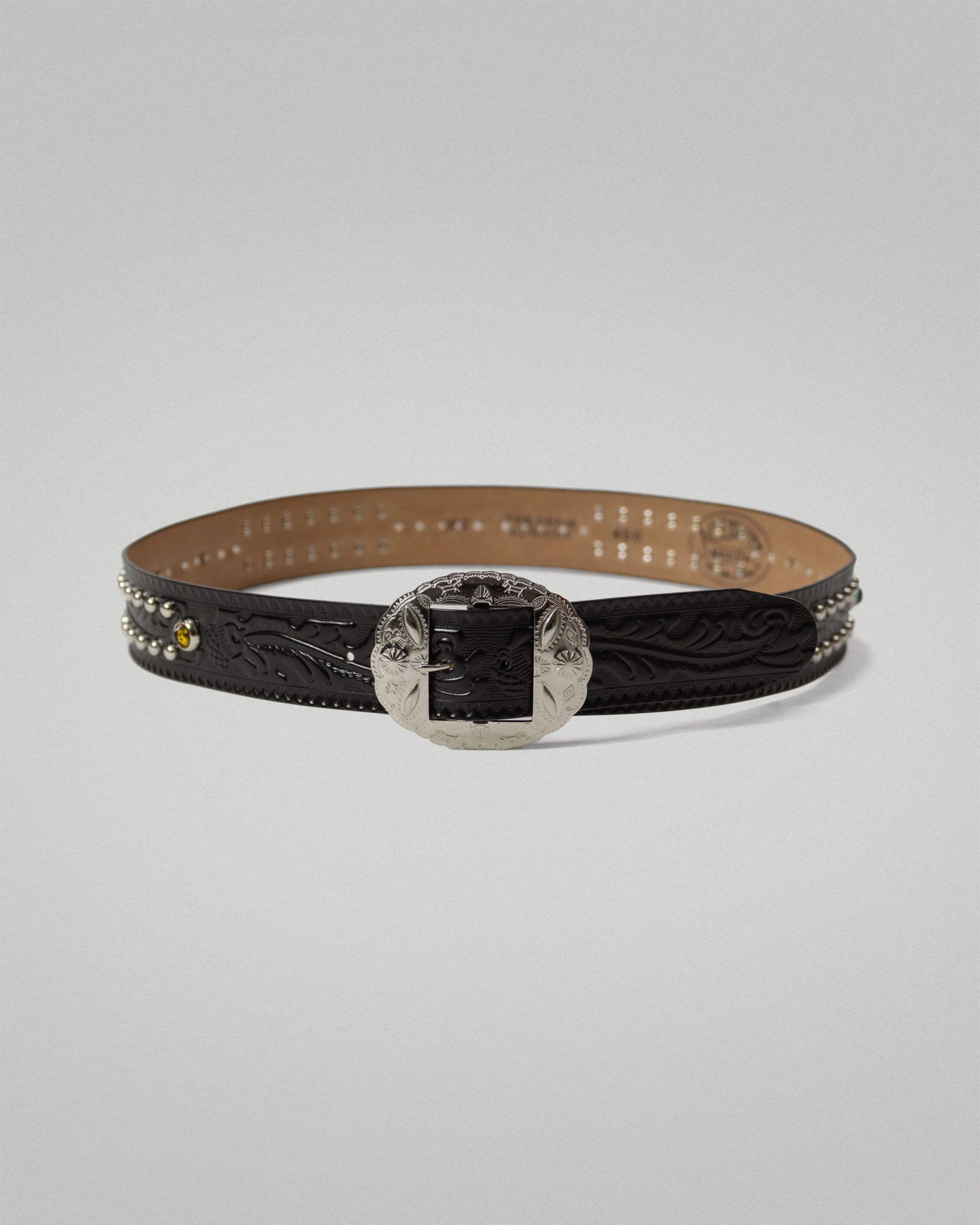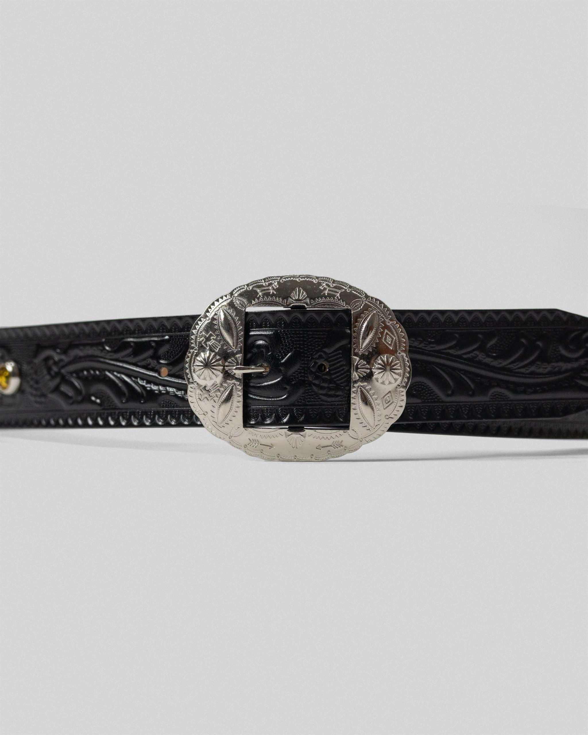 Decorated with over 100 individual pieces of studs and jewels. Based on the belts worn by bikers from the 1950s.